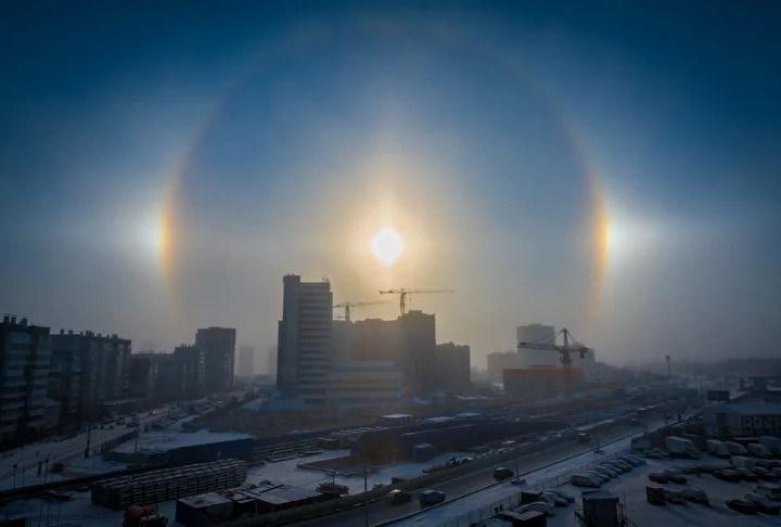Rusya’nın Krasnoyarsk kentinde, hava sıcaklığının eksi 30 dereceye kadar düştüğü sırada nadir görülen bir atmosfer olayı olan “halo” gözlemlendi. Halo, bir ışık kaynağının etrafında ikincil bir parıltı şeklinde beliren optik bir olay olarak biliniyor. Genellikle Güneş veya Ay çevresinde görülen bu olay, sokak lambası gibi güçlü ışık kaynaklarının etrafında da ortaya çıkabiliyor.
